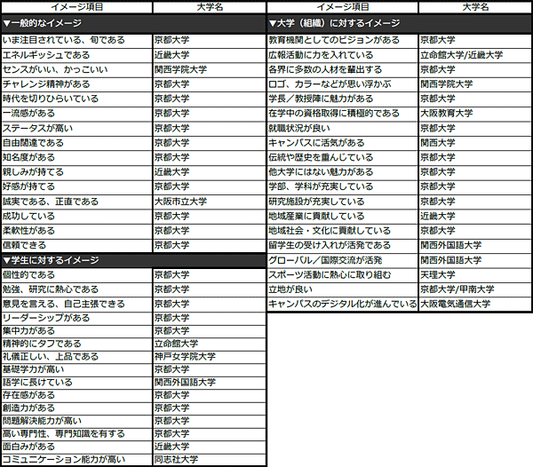 ●【近畿編】各ブランド・イメージ項目で第1位になった大学(49項目:有職者ベース)