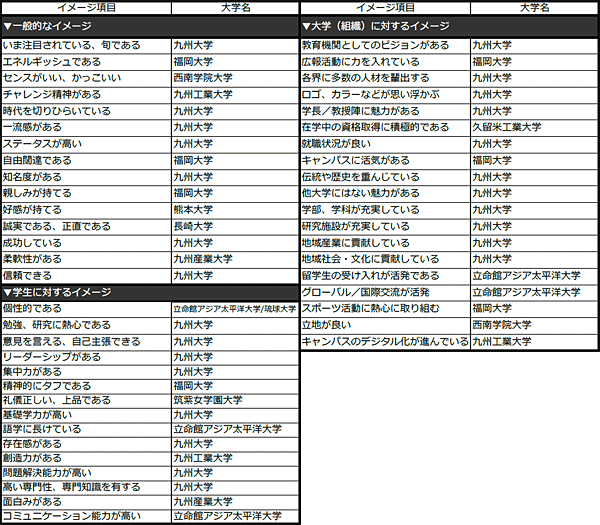 各ブランド・イメージ項目で第1位になった大学をみると、「親しみが持てる」大学として、近畿大学が第1位を獲得した。「広報活動に力を入れている」「地域産業に貢献している」など、大学組織の取り組みに対しても評価が高い。