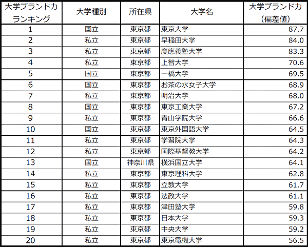 近畿地方の主要大学66校における「大学ブランド力」は、第1位「京都大学」91.7ポイント、第2位「大阪大学」75.8ポイント、第3位「同志社大学」69.4ポイント、第4位「神戸大学」67.6ポイント、第5位「立命館大学」67.0ポイント。トップ10は6位の関西学院大学と7位の関西大学が入れ替わっただけで、顔ぶれは昨年と同じ。12~20位は1、2ポイントを争う接戦となった。