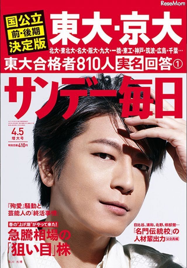 サンデー毎日(4月5日増大号・410円)は、東京大学と京都大学、北海道大学、東北大学、名古屋大学、大阪大学、九州大学、一橋大学、東京工業大学、神戸大学、筑波大学、千葉大学、横浜国立大学、広島大学、東京外国語大学、東京農工大学、東京海洋大学、国際教養大学などの国公立大学の前期と後期合格者高校別ランキングを掲載。東大合格者810人が実名で回答した「合格の秘訣」なども紹介している。